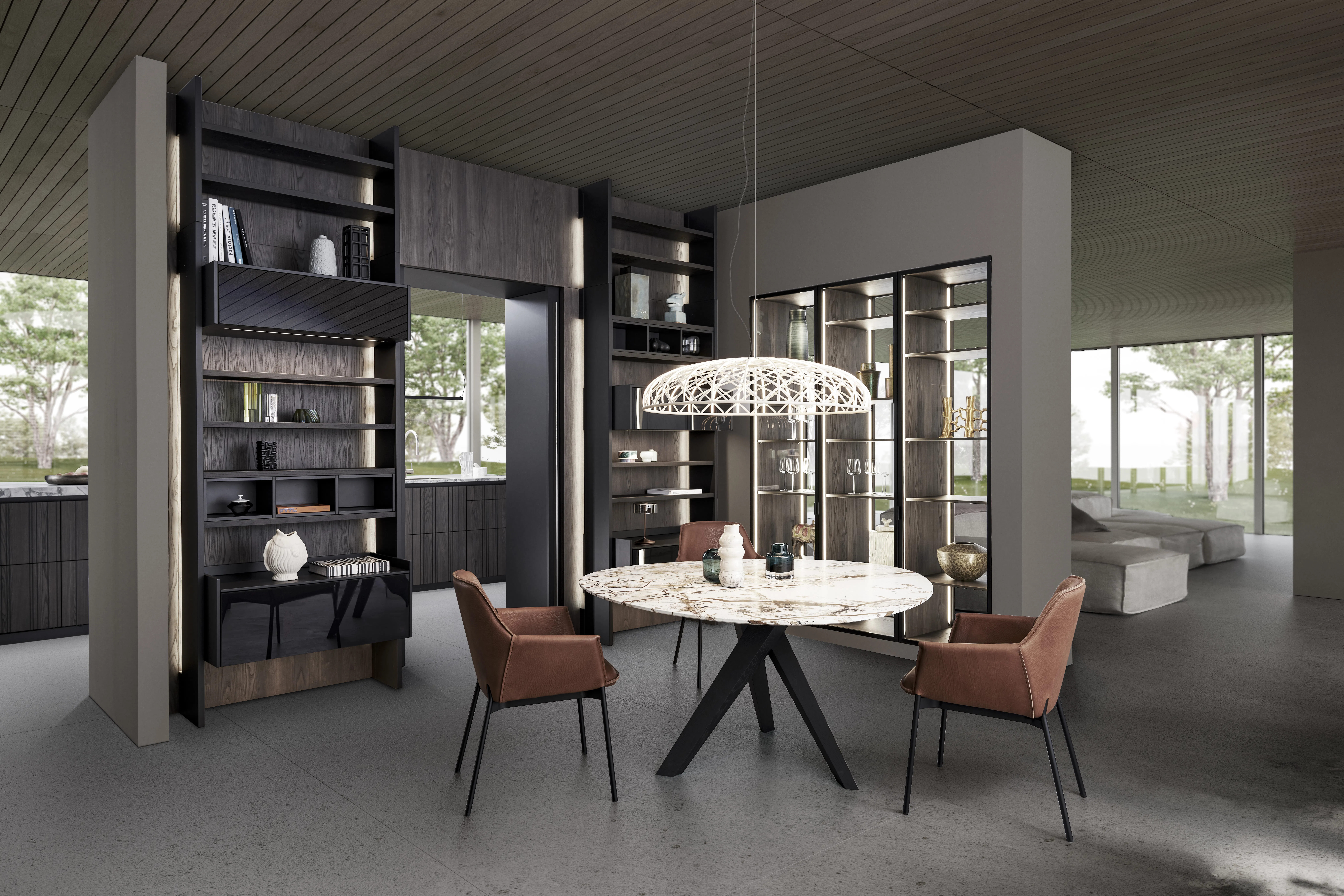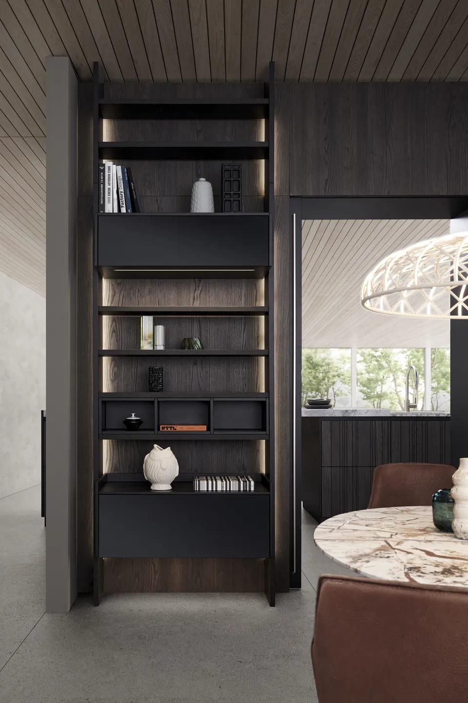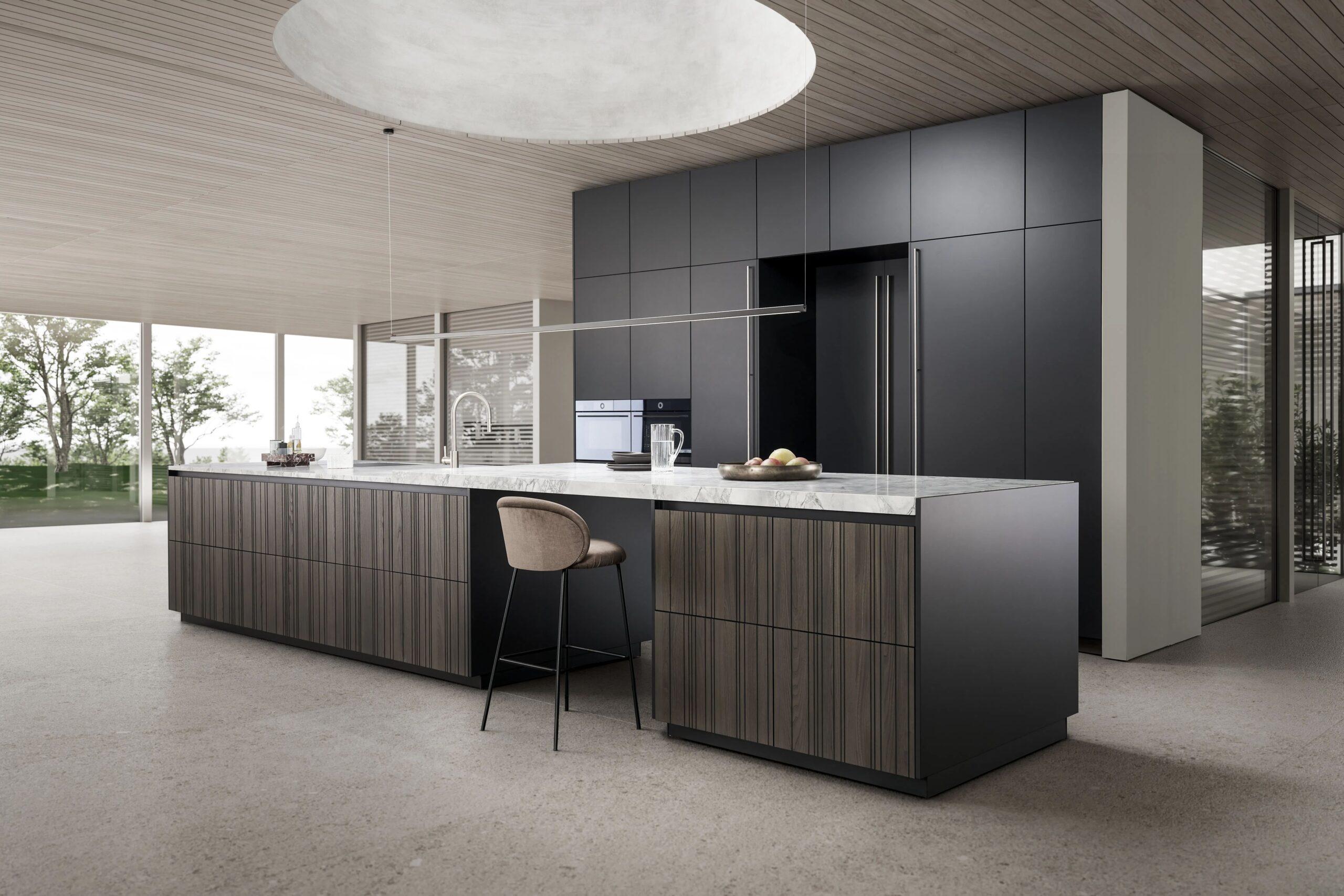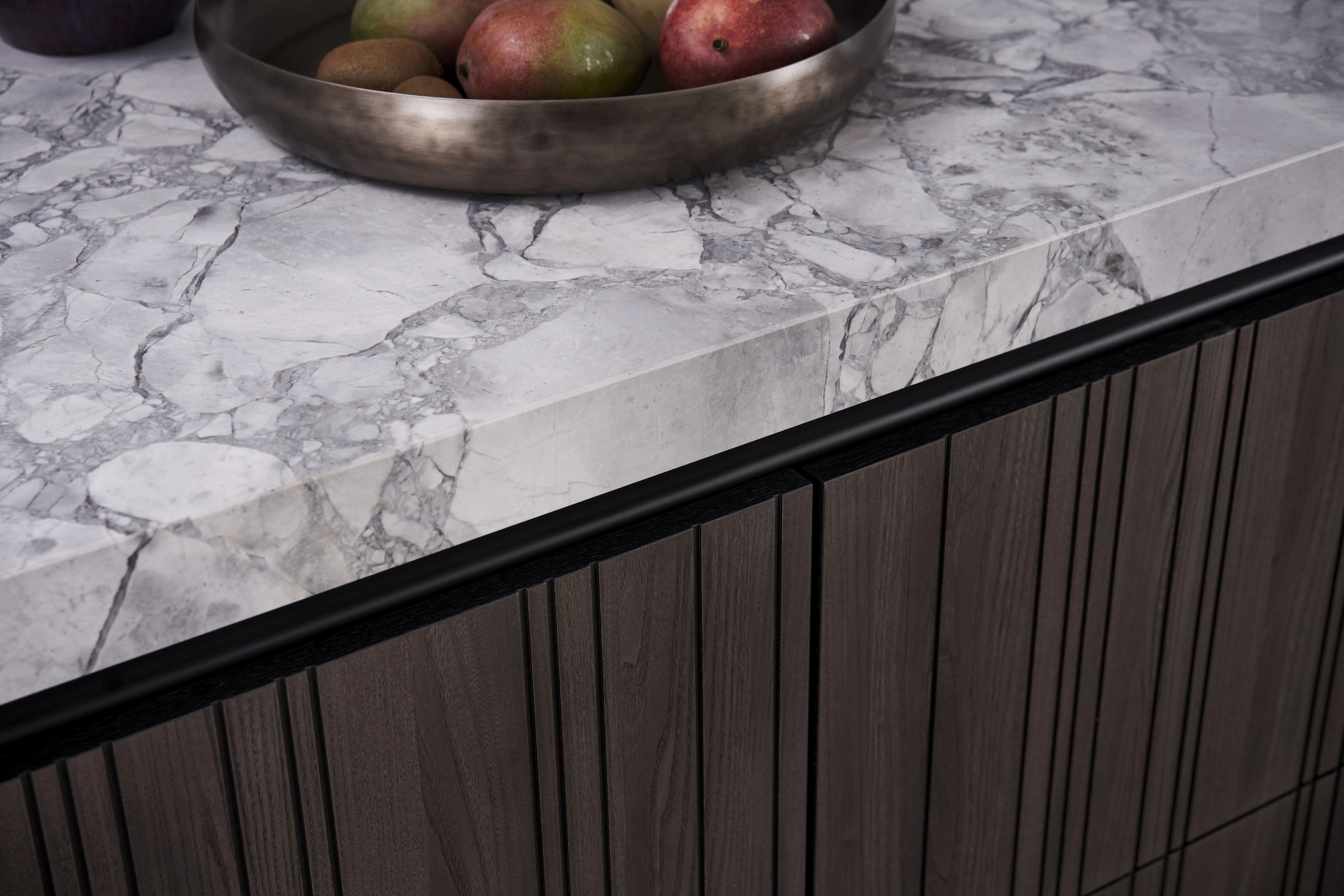 Die Neuheit besteht aus einer Furnierfront, die durch eine vertikale Rillenstruktur eine spannungsreiche Oberfläche erhält. Damit zitiert BAHIA das erfolgreiche Oberflächenprogramm BOSSA von LEICHT, unterscheidet sich aber durch ein entscheidendes Gestaltungsprinzip: Neben dem Kontrast aus erhabener Fläche und Ausfräsung liegt die Besonderheit von BAHIA in der Verbindung zweier scheinbarer Gegensätze: Innerhalb einer Front werden die einzelnen Fräsungen asymmetrisch zueinander gesetzt, doch in der Aneinanderreihung mehrerer Fronten zeichnet sich eine gleiche Struktur der Fächerung ab.