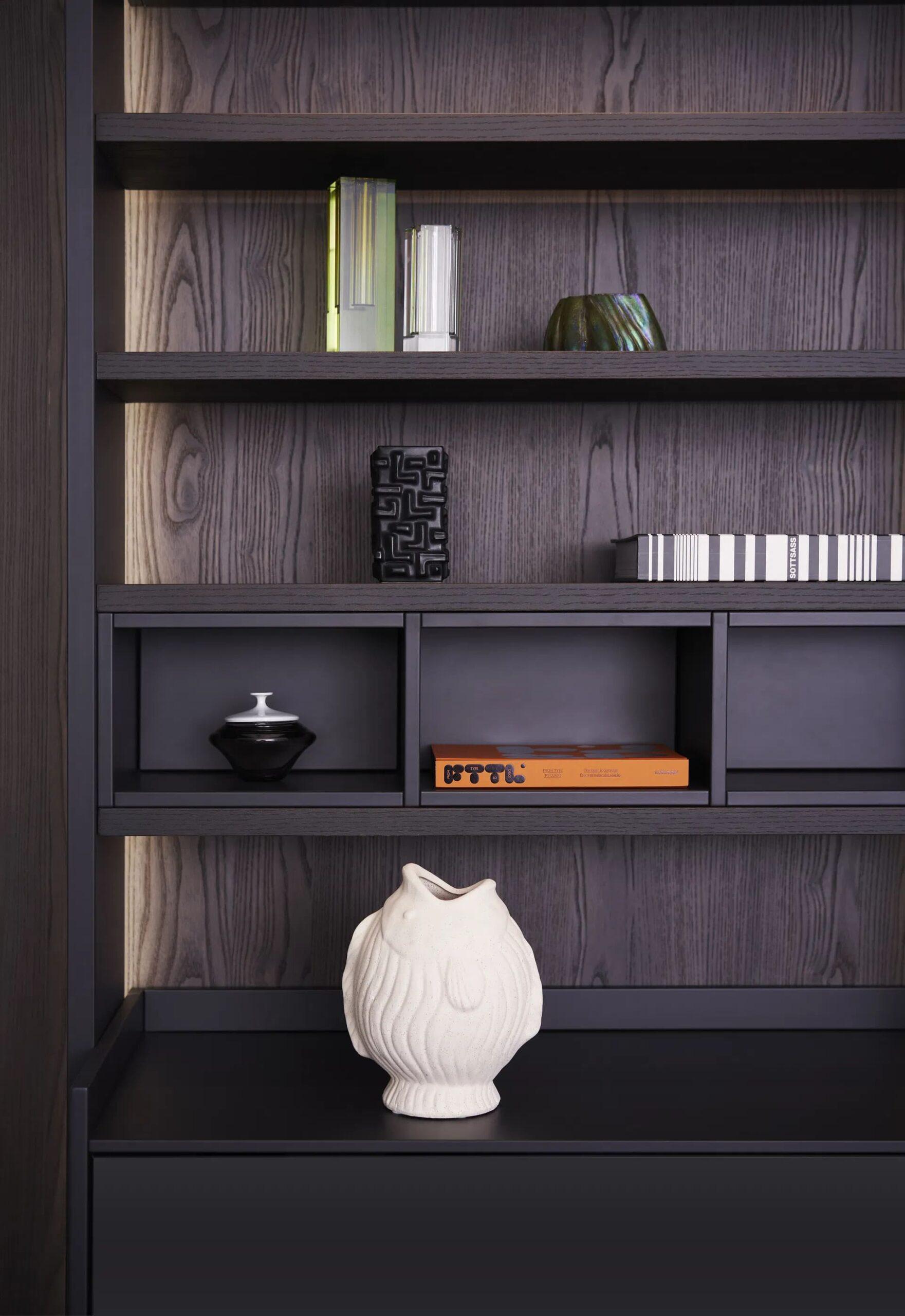 Die einzelnen Schränke verschmelzen optisch zu einem Gesamtmöbel. Diese Besonderheit wird erzeugt, indem die sichtbaren vertikalen Ausfräsungen dunkel gehalten und in der Breite der klassischen vertikalen Fuge ausgeführt sind. Damit wirken die Ausfräsungen optisch wie eine Fuge oder die Fuge wirkt wie eine Ausfräsung – eine perfekte Camouflage.