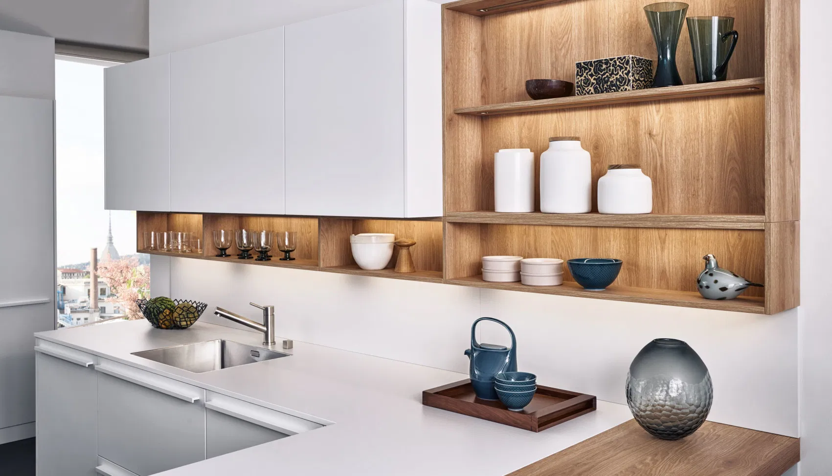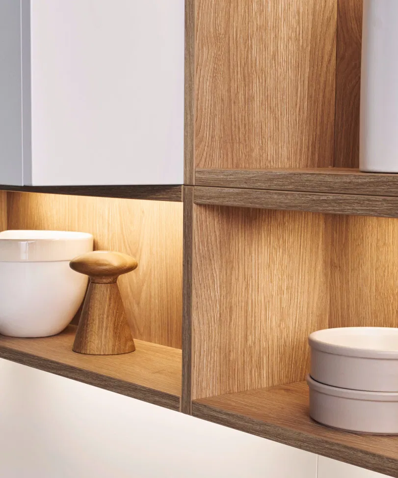Das lichte Weiß, mit einem dezenten Grauanteil, harmoniert elegant mit der fein strukturierten Eiche und gibt dieser offenen Raumplanung ein harmonisches Gesamtbild. Die Regale und offenen Fächer betonen eine angenehme Wohnlichkeit.