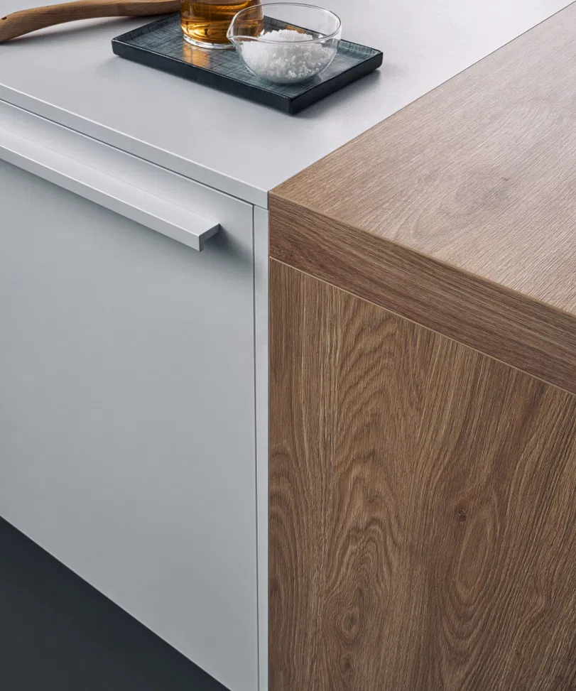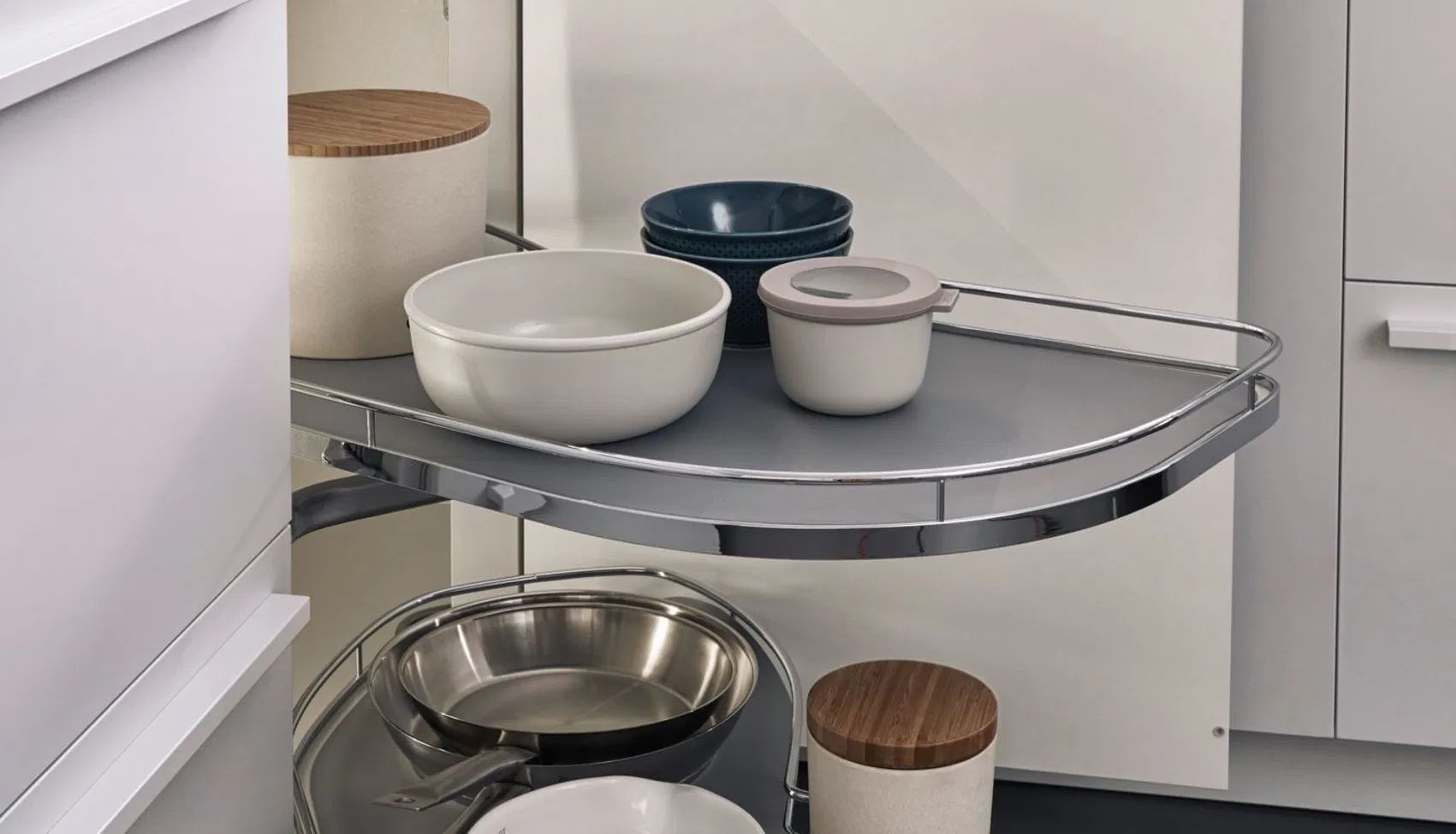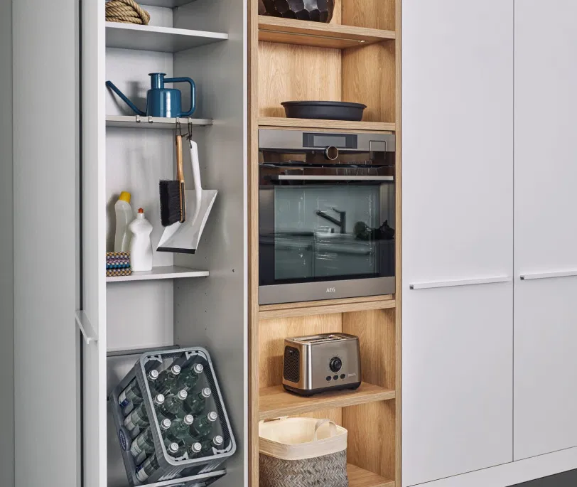 Hinter den äußerlich ruhigen Fronten verbergen sich Stauräume und Ordnungssysteme vom Feinsten. Speziell für Getränkekisten hat LEICHT eine neue Ablage entwickelt. So sind die sperrigen Kisten schnell am richtigen Platz untergebracht und man hat die einzelnen Flaschen im bequemen Zugriff.